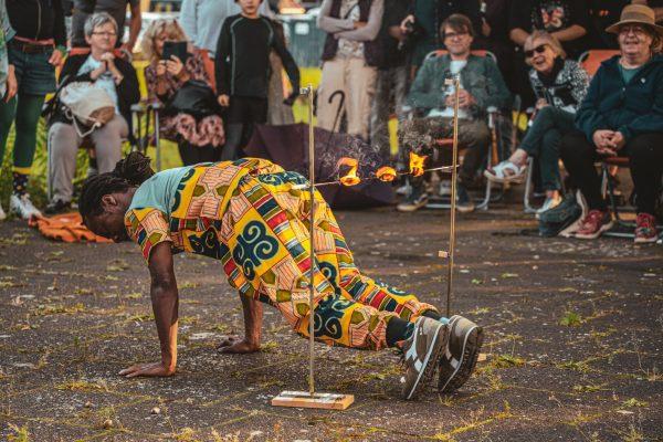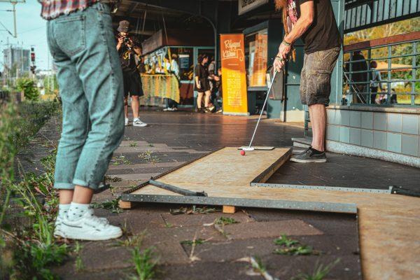 Zugleich war der gesamte Museumsbahnsteig mit Menschen und Aktionen belebt: mit einem bunt bemalten Sound-Container von Klangschichten Ruhr, mit dem komplett ausgefahrenen selbstgebauten Minigolf-Parcours unserer Partner*innen vom Supermarkt der Ideen, mit Sophias Linolschnitt- und Druck- und Button-Press-Werkstatt für alle großen und kleinen Kreativlinge, einem köstlichen Mahl unserer Refugees‘ Kitchen auf schwebendem Tisch, unserer eigenen Bild-/Text- und Video-Ausstellung zu 4 Jahren Utopolis am und im LVR-Museums-Häuschen und Danilos FUni-Bar als kommunikatives Zentrum des Ganzen.